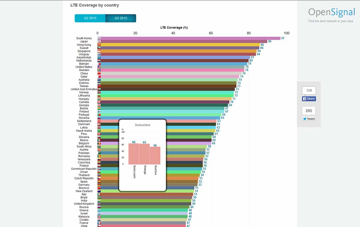 Swisscom ne brille pas dans certains domaines en matière de 4G/LTE, selon le dernier classement d’Opensignal établi pour le mois de septembre. Globalement, par rapport aux opérateurs d’autres pays, les entreprises télécoms suisses sont à peine moyennes.